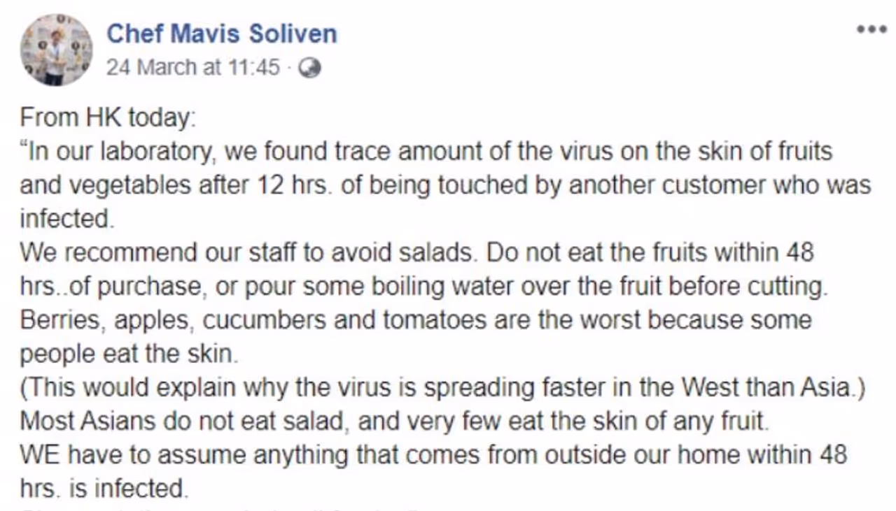 പഴങ്ങളുടെയും പച്ചക്കറികളുടെയും തൊലിയില്12 മണിക്കൂറിലേറെ കൊവിഡ് 19 വൈറസ് ജീവനോടെ നിലനില്ക്കുമെന്ന് ഒരു ഫേസ്ബുക്ക് പോസ്റ്റ് പറയുന്നു. 'സാലഡ് ഉപേക്ഷിക്കണമെന്ന് തൊഴിലാളികളോട് നിർദേശിച്ചു. കടയില് നിന്ന് വാങ്ങി 48 മണിക്കൂറിനുള്ളില് പഴമോ പച്ചക്കറിയോ കഴിക്കാന് പാടില്ലെന്നും ആവശ്യപ്പെട്ടു. അല്ലെങ്കില് ചൂടുവെള്ളത്തില് കഴുകി മാത്രമേ ഉപയോഗിക്കാന് പാടുള്ളൂ'. ഇങ്ങനെ നീളുന്നു ഹോങ്കോങ്ങിലെ പ്രചാരണങ്ങള്.