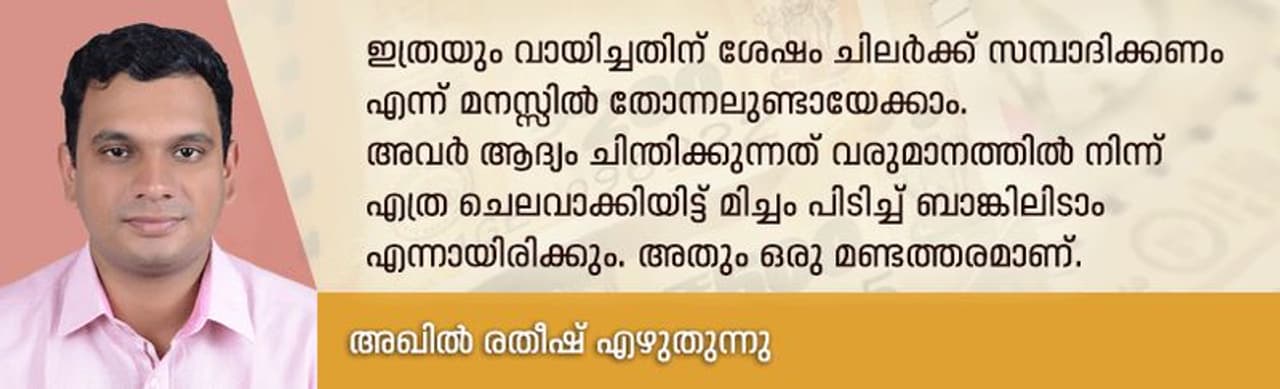 ഇത്രയും വായിച്ചതിന് ശേഷം ചിലര്ക്ക് സമ്പാദിക്കണം എന്ന് മനസ്സില് തോന്നലുണ്ടായേക്കാം. അവര് ആദ്യം ചിന്തിക്കുന്നത് വരുമാനത്തില് നിന്ന് എത്ര ചെലവാക്കിയിട്ട് മിച്ചം പിടിച്ച് ബാങ്കിലിടാം എന്നായിരിക്കും. അതും ഒരു മണ്ടത്തരമാണ്. നിങ്ങള്ക്ക് സാമ്പത്തിക ഭദ്രത ഉറപ്പ് വരുത്താന് ആദ്യം നിക്ഷേപിക്കാനുള്ള ഭാഗം മാറ്റിവെച്ചിട്ട് വേണം നിങ്ങളുടെ ദൈനംദിന ചിലവുകളിലേക്ക് പോലും കടക്കാന്.