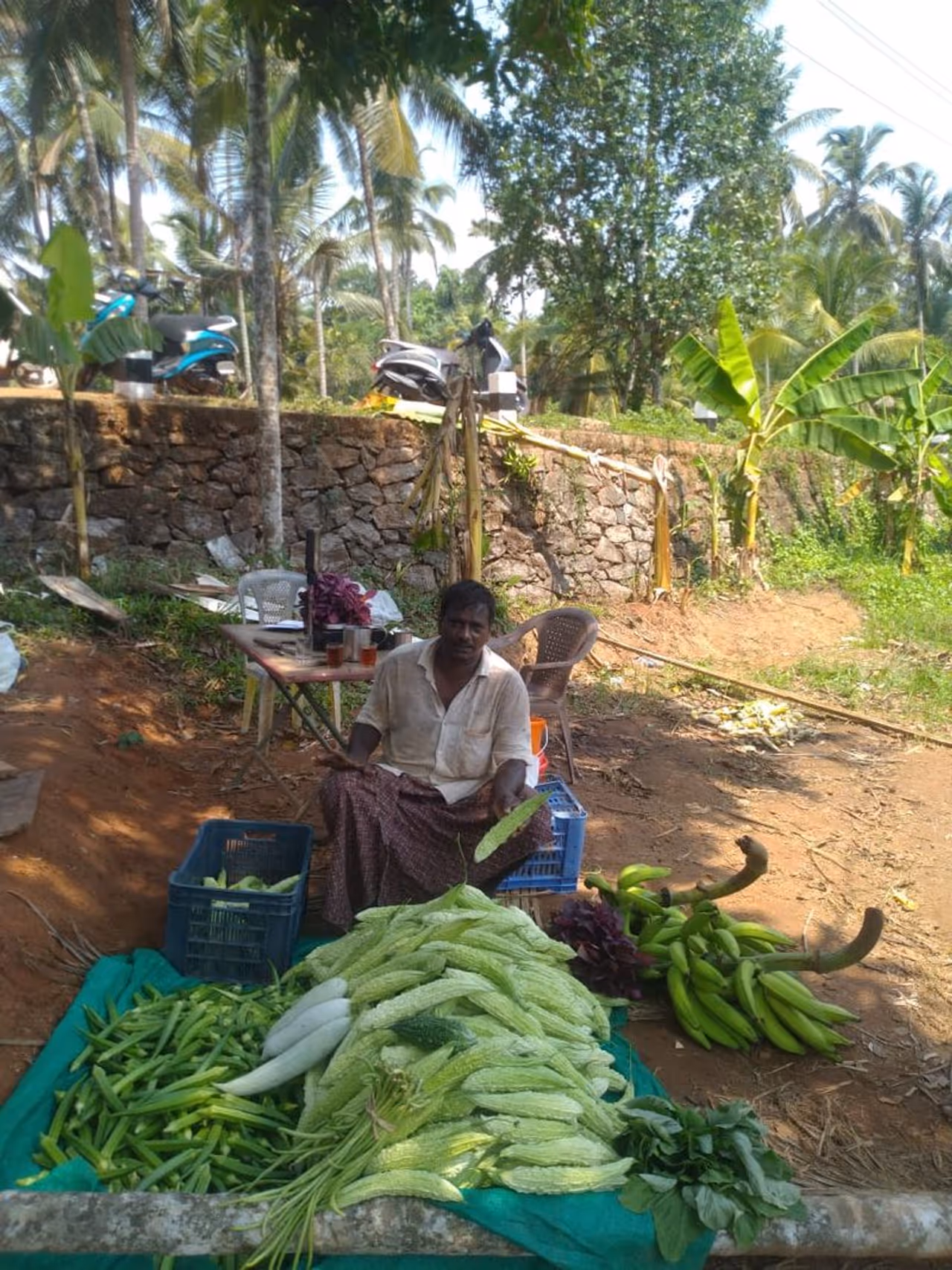 പ്രേമന് വിളവെടുത്ത പച്ചക്കറികളുമായി