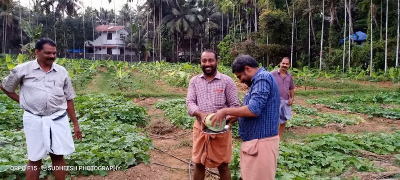 ചുറ്റുവട്ടത്തുള്ളവരും കുടുംബാംഗങ്ങളുമെല്ലാം അടങ്ങിയ കൂട്ടായ്മയില് നിന്ന് രൂപം കൊണ്ട ആശയമാണിതെന്ന് സുധീഷ് വിശദമാക്കുന്നു. 'എല്ലാതരം വിളകളും ഞങ്ങള് കൃഷി ചെയ്തിട്ടുണ്ട്. ചീര,മത്തന്, പാവയ്ക്ക, കണിവെള്ളരി, പടവലം, പീച്ചിങ്ങ, വെണ്ട, ചുരങ്ങ, തണ്ണിമത്തന്, ഇളവന്, കക്കിരി എന്നിവയെല്ലാം ഇവിടെയുണ്ട്. നല്ല വിളവും ലഭിക്കുന്നുണ്ട്. സംഘത്തിലെ 22 പേരുടെയും വീടുകളിലേക്ക് ആവശ്യമുള്ള പച്ചക്കറികള് ഈ കൃഷിഭൂമിയില് നിന്ന് കിട്ടും. അതുകൂടാതെ പുറത്ത് ആളുകള്ക്കും പച്ചക്കറികള്ക്ക് വില്ക്കുന്നുണ്ട്. ലോക്ക്ഡൗണ് കാലത്ത് കുറേപ്പേര് രാവിലെയോ വൈകുന്നേരമോ ഓരോ മണിക്കൂര് വയലിന്റെ അരികിലുള്ള റോഡിന്റെ സൈഡിലായി പച്ചക്കറികള് വെച്ച് വില്പ്പന നടത്തുന്നുണ്ട്'