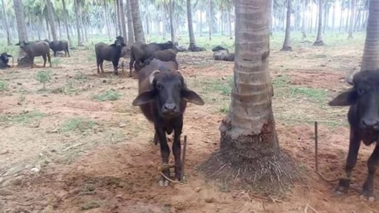 പകല് സമയത്ത് എരുമകളെ പറമ്പില് മേയാന് വിടുകയാണ് ചെയ്യുന്നത്. രാത്രികാലങ്ങളില് കയര് ഉപയോഗിച്ച് ഫാമില് വരിവരിയായി കെട്ടിയിടുന്നു. ചാണകവും മൂത്രവും കൃഷിഭൂമിയില് നേരിട്ട് ലഭ്യമാക്കാവുന്ന വിധത്തിലാണ് എരുമകള്ക്കുള്ള താമസസ്ഥലം ഒരുക്കിയിരിക്കുന്നത്. ഇത് മണ്ണിലെ പോഷകഗുണം വര്ധിപ്പിക്കുകയും കളകള് ഇല്ലാതാക്കുകയും ചെയ്യുന്നു.