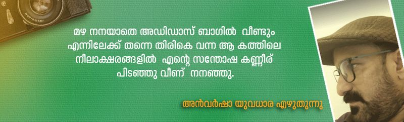 മഴനനായതെ അഡിഡാസ് ബാഗില് വീണ്ടും എന്നിലേക്ക് തന്നെ തിരികെ വന്ന ആ കത്തിലെ നീലാക്ഷരങ്ങളില് എന്റെ സന്തോഷ കണ്ണീര് പിടഞ്ഞു വീണ് നനഞ്ഞു.