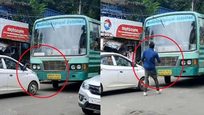മറ്റൊരു ബസിനെ മറികടന്ന് എതിർദിശയിലെത്തിയ ബസിനു മുന്നില് കേരള രജിസ്ട്രേഷനുള്ള കാര് നിര്ത്തിയിടുകയായിരുന്നു യുവാവ്. ഇതോടെ മുന്നോട്ടെടുക്കാന് കഴിയാതെ ബസ് ഡ്രൈവര് പെട്ടു. ഇതിനിടെ കാറില് നിന്നിറങ്ങിയ യുവാവ് ബസ് ഡ്രൈവറോട് കയര്ക്കുന്നതും വീഡിയോയില് കാണാം. ഒടുവില് ഗതാഗതക്കുരുക്കായതോടെ നാട്ടുകാരെത്തി യുവാവിനെ അനുനയിപ്പിച്ച് കാറില്ക്കയറ്റിയാണ് ബസിന് പോകാനുള്ള വഴി ഒരുക്കിയത്.