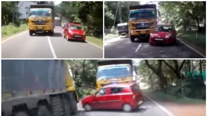 ഒരു കാറിനെ മറികടക്കാൻ ഒരു ടിപ്പര് ലോറി ശ്രമിക്കുന്നതിനിടെയാണ് അപകടം. ഓവർടേക്ക് ചെയ്യാൻ ശ്രമിച്ചപ്പോൾ എതിരെ വാഹനം വന്നതുകൊണ്ട് ഇടതു വശത്തേയ്ക്ക് ഒതുക്കാൻ ടിപ്പര് ഡ്രൈവര് ശ്രമിച്ചു. അപ്പോൾ കാറിന്റെ പിന്നിൽ തട്ടുകയായിരുന്നു. റോഡില് വട്ടംതിരിഞ്ഞ് ടിപ്പറിന്റെ മുന്നിലേയ്ക്ക് എത്തിയ കാറിനെ എതിരെ വന്ന മറ്റൊരു ടിപ്പര് ലോറി ഇടിച്ചുതെറിപ്പിക്കാതിരുന്നത് തലനാരിഴയുടെ വ്യത്യാസത്തിലാണെന്നും വീഡിയോയില് വ്യക്തമായി കാണാം. അപകടം നടന്ന സ്ഥലം ഉള്പ്പെട അപകടത്തിന്റെ കൂടുതൽ വിവരങ്ങൾ ലഭ്യമല്ല.