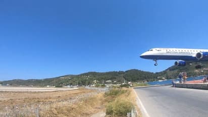 ബീച്ചിന് തൊട്ടടുത്തുള്ള പടിയില് കയറിയവരൊക്കെ വിമാനം കടന്നുപോയപ്പോഴുണ്ടായ ശക്തമായ കാറ്റില് നിലത്തേക്ക് വീണു. ഗ്രീസിലെ സ്കിയാത്തോസ് വിമാനത്താവളത്തില് നിന്നുള്ളതാണ് കാഴ്ച. കടലിനോട് ചേര്ന്നുള്ള വിമാനത്താവളത്തിന്റെ റണ്വേയും കടലിനും ഇടയില് ഏതാനും മീറ്ററുകള് മാത്രമാണുള്ളത്.
