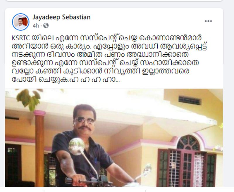 എന്നാല് തന്നെ സസ്പെന്ഡ് ചെയ്ത നടപടിയെ പരിഹസിച്ച് സോഷ്യല് മീഡിയയിലൂടെ രംഗത്തെത്തിയിരിക്കുകയാണ് സസ്പെന്ഷനിലായ കെഎസ്ആര്ടിസി ഡ്രൈവർ എസ് ജയദീപ്. തന്റെ ഫേസ് ബുക്ക് പേജിലൂടെ രൂക്ഷമായ ഭാഷയിലുള്ള നിരവധി പോസ്റ്റുകളാണ് അദ്ദേഹം ഇതുസംബന്ധിച്ച് പങ്കുവയ്ക്കുന്നത്.