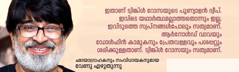 ഇതാണ് ട്വിങ്കിള് റോസയുടെ പുണ്യാളന് ദ്വീപ്. ഇവിടെ യഥാര്ത്ഥമല്ലാത്തതൊന്നും ഇല്ല. ഇവിടുത്തെ സ്വപ്നങ്ങള്പോലും സത്യമാണ്. ആര്നോള്ഡ് വാവയും ഡോള്ഫിന് കാമുകനും പ്രേതവള്ളവും പശപ്പറ്റും ശരിക്കുള്ളതാണ്. ട്വിങ്കിള് റോസയും സത്യമാണ്.