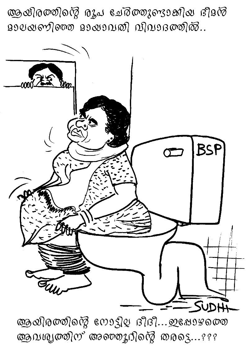 സര്ക്കാര് ഖജനാവില്നിന്ന് കോടികള് ചെലവഴിച്ച് മായാവതി സ്വന്തം പ്രതിമകള് നാടുനീളെ സ്ഥാപിക്കുമ്പോള്, ഉത്തര് പ്രദേശിലെ യുവതികള് റോഡരികിലും തീവണ്ടിപ്പാതയുടെ ഓരത്തും കുന്തിച്ചിരുന്നാണ് മലമൂത്രവിസര്ജ്ജനം നടത്തുന്നത് എന്ന് കാര്ട്ടൂണിസ്റ്റ് അഭിപ്രായപ്പെടുന്നു. ഉത്തര് പ്രദേശിലൂടെ ബസ്സിലോ തീവണ്ടിയിലോ സഞ്ചരിച്ചാല് ആയിരക്കണക്കിനു സ്ത്രീകളെ ഇത്തരം ഒരു ദയനീയ അവസ്ഥയില് നമുക്ക് കാണാം. താന് ഭരിക്കുന്ന ജനതയുടെ ദാരിദ്ര്യത്തെ നോക്കി കൊഞ്ഞനം കുത്തുന്നതുപോലെയാണ് ഉത്തര്പ്രദേശില് സ്ഥാപിച്ചിരിക്കുന്ന മായാവതിയുടെ പ്രതിമകള്. ഒരു സ്ത്രീ മലമൂത്രവിസര്ജ്ജനം നടത്തുന്ന രംഗം കാര്ട്ടൂണില് ആവിഷ്കരിക്കേണ്ടിവന്നത് ഈ ഒരു സാഹചര്യത്തിലാണ്. അത് ഒഴിവാക്കാമായിരുന്നു എന്ന് കാര്ട്ടൂണിസ്റ്റിന് വീണ്ടുവിചാരമുണ്ടായി.