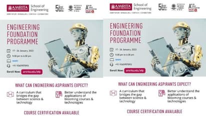 2021 നാഷണൽ ഇൻസ്റ്റിറ്റ്യൂഷൻ റാങ്കിംഗ് ഫ്രെയിംവർക്കിൽ (NIRF) ഇന്ത്യയിലെ 5-മത്തെ മികച്ച സർവ്വകലാശാലയായി തെരഞ്ഞെടുക്കപ്പെട്ട അമൃത വിശ്വ വിദ്യാപീഠം എൻജിനീയറിങ്ങിനുള്ള സൗജന്യ സർട്ടിഫൈഡ് ഫൗണ്ടേഷൻ പ്രോഗ്രാമുകൾ പ്രഖ്യാപിച്ചു . 10 ദിവസമായി നടക്കുന്ന ഫൗണ്ടേഷൻ പ്രോഗ്രാമുകൾ ജനുവരി 17 മുതൽ 26 വരെയാണ് നടക്കുക. +2 പഠനത്തിന് ശേഷം എഞ്ചിനീയറിംഗ് സ്ട്രീമിലേക്കുള്ള മാറ്റം ആഗ്രഹിക്കുന്നവർക്ക് ഏറ്റവും മികച്ച അടിത്തറ പാകുകയെന്നതാണ് ഈ ഫൗണ്ടേഷൻ പ്രോഗ്രാമിലൂടെ ലക്ഷ്യം വയ്ക്കുന്നത്. എഞ്ചിനീയറിംഗിന്റെ അടിത്തറയായ ഭൗതികശാസ്ത്രത്തിലും ഗണിതത്തിലും പ്രായോഗിക പരിജ്ഞാനം സൃഷ്ടിക്കുക, ചുറ്റുമുള്ള എല്ലാ കാര്യങ്ങളും ഒരു എഞ്ചിനീയറിംഗ് നിരീക്ഷണ പാഠവത്തോടെ കണ്ട് മനസിലാക്കുക തുടങ്ങിയ കാര്യങ്ങളാണ് പ്രോഗ്രാമിലുണ്ടാവുക.