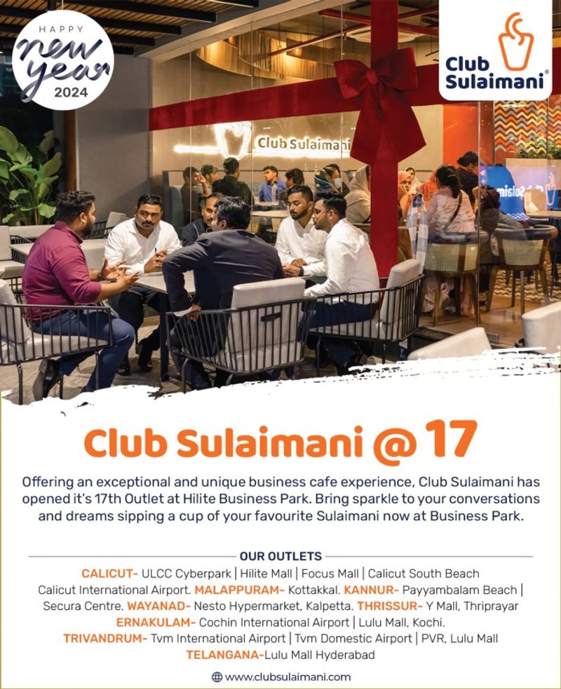 അതിവേഗ വളർച്ചയുടെ പുതിയ നാഴികക്കല്ല് താണ്ടി കേരളത്തിലെ മുൻനിര ടീ കഫേ ശൃംഖല 'ക്ലബ് സുലൈമാനി'. ക്ലബ് സുലൈമാനിയുടെ 17-ാമത് ഔട്ട് ലെറ്റ് കോഴിക്കോട്ടെ ഹൈലൈറ്റ് ബിസിനസ് പാർക്കിൽ പ്രവർത്തനം തുടങ്ങി. കേരളത്തിലെ ആദ്യത്തെ ടീ കഫെ ശൃംഖലയാണ് ക്ലബ് സുലൈമാനി.