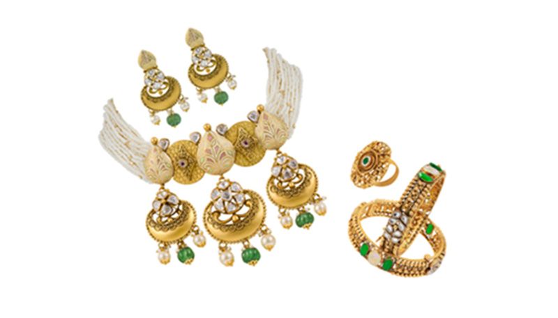 കൂടാതെ ഈ ആഘോഷവേളയിൽ സ്വന്തമാക്കാനും പ്രിയപ്പെട്ടവർക്ക് സമ്മാനിക്കാനുമായി പാരമ്പര്യവും ആധുനികതയും ഒത്തു ചേരുന്ന ആഭരണങ്ങളുടെ ശേഖരമായ മുഹരത്ത് കളക്ഷനും കാലമെത്ര കഴിഞ്ഞാലും പുതുമ നഷ്ടപ്പെടാത്ത സങ്കല്പ് കളക്ഷനും അവതരിപ്പിക്കുന്നു. ഈ ദീപാവലി നാളുകളിൽ അണിയുവാൻ നിങ്ങൾക്കായി കല്യാൺ അവതരിപ്പിക്കുന്ന ശേഖരങ്ങളിലെ ഓരോ ആഭരണവും ഓരോ കഥപറയും. പ്രകൃതിയുമായി ഇണങ്ങി നിൽക്കുന്ന വെള്ള മുത്തുകളും പച്ച കല്ലുകളും പതിച്ച ഈ ചോക്കർ സെറ്റ് വ്യത്യസ്ഥമാകുന്നതും അതിനാലാണ്. ചോക്കറിനൊപ്പമുള്ള കമ്മലുകളും വളകളും അണിയുന്നവരെ ഏതൊരാൾക്കൂട്ടത്തിലും വ്യത്യസ്തയാക്കും. പാരമ്പര്യതനിമക്കൊപ്പം സൂക്ഷ്മതയും ചാരുതയും കലർന്ന ഈ ആഭരണ ശേഖരം നിങ്ങളുടെ ദീപാവലി വസ്ത്രങ്ങൾക്കൊപ്പം പ്രകാശിക്കുവാൻ നിർമ്മിച്ചവയാണ്.