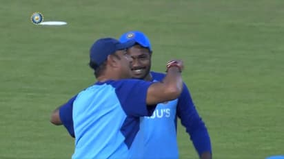 ഇതോടെ ചിരിച്ചുകൊണ്ട് ആരാധകരെ തിരിച്ച് അഭിവാദ്യം ചെയ്ത സഞ്ജു നടന്നു നീങ്ങുന്നതിനിടെ പരിശീലകനായ രവി ശാസ്ത്രി സഞ്ജുവിന്റെ തോളില് കൈയിട്ടു ചേര്ത്തുപിടിച്ചു. ആരാധകരെ നോക്കി ചിരിച്ചുകൊണ്ട് സഞ്ജുവിനെ ഇടിക്കുന്നപോലെ ആംഗ്യം കാട്ടിയ രവി ശാസ്ത്രി സഞ്ജുവിനെ പുറത്തുതട്ടി പ്രോത്സാഹിപ്പിക്കുകയും ചെയ്തു. സഞ്ജുവാകട്ടെ പതിവുപോലെ എല്ലാം ഒരു ചിരിയോടെ നേരിട്ടു.