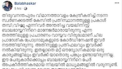 തിരുവനന്തപുരം: തിരുവനന്തപുരം വിമാനത്താവളം വഴിയുള്ള സ്വർണ്ണക്കടത്ത് കേസിൽ അറസ്റ്റിലായ ഇടനിലക്കാരായ വിഷ്ണു, പ്രകാശ് തമ്പി എന്നിവർക്ക് അന്തരിച്ച വയലിനിസ്റ്റ് ബാലഭാസ്കറുമായി ബന്ധമുണ്ടെന്ന വാർത്തകൾക്കെതിരെ ബാലഭാസ്കരിന്റെ ഭാര്യ. പ്രചാരണം വാസ്തവ വിരുദ്ധമാണെന്നും ചില പ്രാദേശിക പ്രോഗ്രാമുകളുടെ കോർഡിനേഷൻ മാത്രമാണ് ഇവർ നടത്തിയിരുന്നതെന്നും ലക്ഷ്മി ബാലഭാസ്കർ ഫേസ്ബുക്ക് പോസ്റ്റിൽ വ്യക്തമാക്കി.