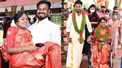 മാവേലിക്കര: പേശീക്ഷയം മൂലം കാലുകൾ തളർന്ന് 14 വർഷമായി ചക്രക്കസേരയിലാണ് ചെട്ടികുളങ്ങര ഈരേഴ വടക്ക് വിനീഷ് ഭവനം വിനീതയുടെ ജീവിതം. തളർന്ന കാലുകളെ മറന്ന് പുതിയ പ്രതീക്ഷകളുടെ ജീവിതത്തിലേക്ക് കാലെടുത്തുവയ്ക്കുകയാണ് വിനീതയിപ്പോൾ. പ്രതീക്ഷയുടെ ചിറകിലേറി നടക്കാൻ വിനീതയുടെ കാലുകൾക്ക് കരുത്തായി ഇനി സുബ്രഹമണ്യൻ ഉണ്ടാകും. ഇന്ന് രാവിലെ ഒമ്പതു മണിയോടെയാണ് വിനീതയ്ക്ക് സുബ്രഹ്മണ്യൻ താലി ചാർത്തിയത്. മറ്റം മഹാദേവർ ക്ഷേത്രത്തിലായിരുന്നു ചടങ്ങുകൾ.