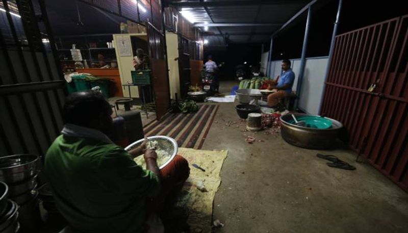 സമയം വൈകുന്നേരം അഞ്ച് മണി: അടുക്കളയ്ക്കിപ്പോൾ പച്ചടിയുടേയും കിച്ചടിയുടേയും മണമാണ്. പുളിശ്ശേരി അടക്കമുള്ള വിഭവങ്ങൾ തയ്യാറാക്കുന്നതിന്റെ തിരക്കുകളിലേക്ക് പാചകക്കാർ തിരിഞ്ഞു കഴിഞ്ഞു. അതിന് ശേഷം അവിയൽ, സാമ്പാർ, വറുത്ത എരിശ്ശേരി തുടങ്ങിയവയ്ക്കുള്ള പച്ചക്കറികളരിഞ്ഞ് തുടങ്ങി. രാത്രിയേറെയായാലും ജോലി തീരുന്നേയില്ല. പിറ്റേന്ന് ആളുകൾ ഉണ്ടെഴുന്നേറ്റ് മടങ്ങുന്നത് വരെ എവിടെ വിശ്രമം.