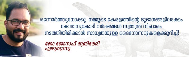 ഒന്നോര്ത്തുനോക്കൂ - നമ്മുടെ കേരളത്തിന്റെ ഭൂഭാഗങ്ങളിലടക്കം കോടാനുകോടി വര്ഷങ്ങള് സ്വതന്ത്ര വിഹാരം നടത്തിയിരിക്കാന് സാധ്യതയുള്ള ദൈനോസറുകളെക്കുറിച്ച്! നമ്മുടെ കോയമ്പത്തൂരും, തിരുവനന്തപുരത്തും, മദ്രാസിലും, ബാംഗ്ലൂരിലുമെല്ലാം കോടിക്കണക്കിന് വര്ഷങ്ങള്ക്ക് മുന്പ് അലഞ്ഞു തിരിഞ്ഞ് നടന്നിരുന്ന ഭീമാകാരന് പല്ലികള്.