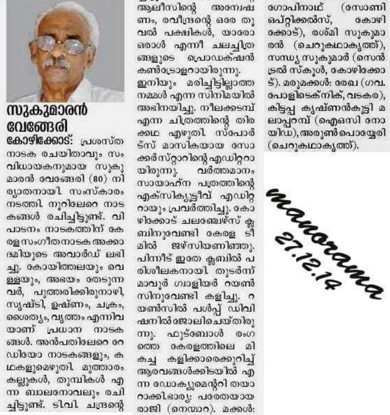 കാല്പ്പന്തുകളിയെക്കുറിച്ച് നിര്മിച്ച ആരവങ്ങള്ക്കിടയില്' എന്ന ഡോക്യുമെന്ററിയുടെ നിര്മാണത്തിനിടെ സുകുമാരന് വേങ്ങേരി