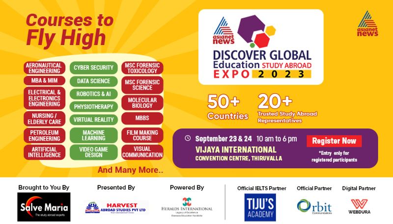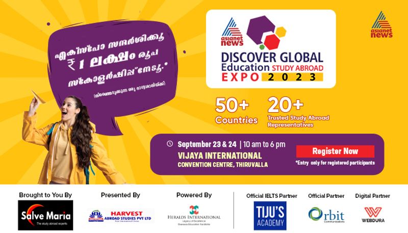 2023 സെപ്റ്റംബർ 23,24 തീയതികളിൽ തിരുവല്ലയിലെ വിജയ ഇന്റർനാഷണൽ കൺവെൻഷൻ സെന്ററിൽ വെച്ചാണ് എക്സ്പൊ നടക്കുന്നത്. രാവിലെ 9.30 മുതല് 6 മണി വരെ നടക്കുന്ന പരിപാടിയില് മുന്കൂട്ടി രജിസ്റ്റര് ചെയ്തവര്ക്ക് മാത്രമാണ് പ്രവേശനം. എക്സ്പൊയില് പങ്കെടുക്കുന്ന വിദ്യാര്ഥികളില് നിന്ന് തെരഞ്ഞെടുക്കുന്ന ഒരു ഭാഗ്യശാലിക്ക് 1 ലക്ഷം രൂപയുടെ സ്കോളർഷിപ്പും ലഭിക്കുന്നു .വിദേശ പഠനത്തെ കുറിച്ചുള്ള എല്ലാ ചോദ്യങ്ങള്ക്കും ഈ എക്സ്പൊ ഉത്തരം നല്കും. സുരക്ഷിതമായി വിദേശരാജ്യങ്ങളിലേക്ക് എത്തുന്നതിനുളള വഴികാട്ടിയുമാകും. അമ്പതോളം രാജ്യങ്ങളിലെ കോഴ്സുകളില് നിന്ന് ഇഷ്ടപ്പെട്ട കോഴ്സ് തെരഞ്ഞെടുക്കാനുമാകും. ആയിരത്തിലധികം വിദേശ സര്വകലാശാലകളിലെ പ്രോഗ്രാമുകളെക്കുറിച്ച് അറിയാനും എക്സ്പൊ അവസരമൊരുക്കുന്നു.