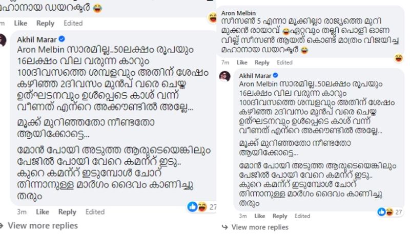 "സാരമില്ല..50ലക്ഷം രൂപയും 16ലക്ഷം വില വരുന്ന കാറും 100ദിവസത്തെ ശമ്പളവും അതിന് ശേഷം കഴിഞ്ഞ 2ദിവസം മുൻപ് വരെ ചെയ്ത ഉത്ഘടനവും ഉൾപ്പെടെ കാശ് വന്ന് വീണത് എന്റെ അക്കൗണ്ടിൽ അല്ലേ...മൂക്ക് മുറിഞ്ഞതോ നീണ്ടതോ ആയിക്കോട്ടെ...മോൻ പോയി അടുത്ത ആരുടെയെങ്കിലും പേജിൽ പോയി വേറെ കമന്റ് ഇടു..കുറെ കമന്റ് ഇടുമ്പോൾ ചോറ് തിന്നാനുള്ള മാർഗം ദൈവം കാണിച്ചു തരും", എന്നായിരുന്നു അഖിൽ മാരാർ നൽകിയ മറുപടി. ഇതിന് കയ്യടിച്ച് നിരവധി പേരാണ് രംഗത്ത് എത്തിയത്.