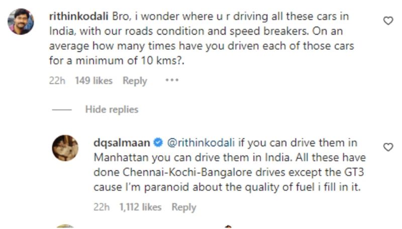 'ബ്രോ നമ്മുടെ നാട്ടിയെ റോഡുകളുടെ അവസ്ഥയും സ്പീഡ് ബ്രേക്കറുകളുമെല്ലാം വച്ച് നിങ്ങള് ഈ കാറുകളെല്ലം ഇന്ത്യയില് എവിടെയാണ് ഓടിക്കുന്നതെന്നാണ് ഞാന് അത്ഭുതപ്പെടുന്നത്. ശാരാശരി 10 കിലോമീറ്ററെങ്കിലും വോഗതയില് നിങ്ങള് ഈ ഓരോ കാറും വിടെ എത്ര തവണ ഓടിച്ചിട്ടുണ്ട്', എന്നായിരുന്നു ആരാധകന്റെ കമന്റ്. ഇത് ശ്രദ്ധയിൽപ്പെട്ട ദുൽഖർ ഉടൻ തന്നെ മറുപടിയും നൽകി.