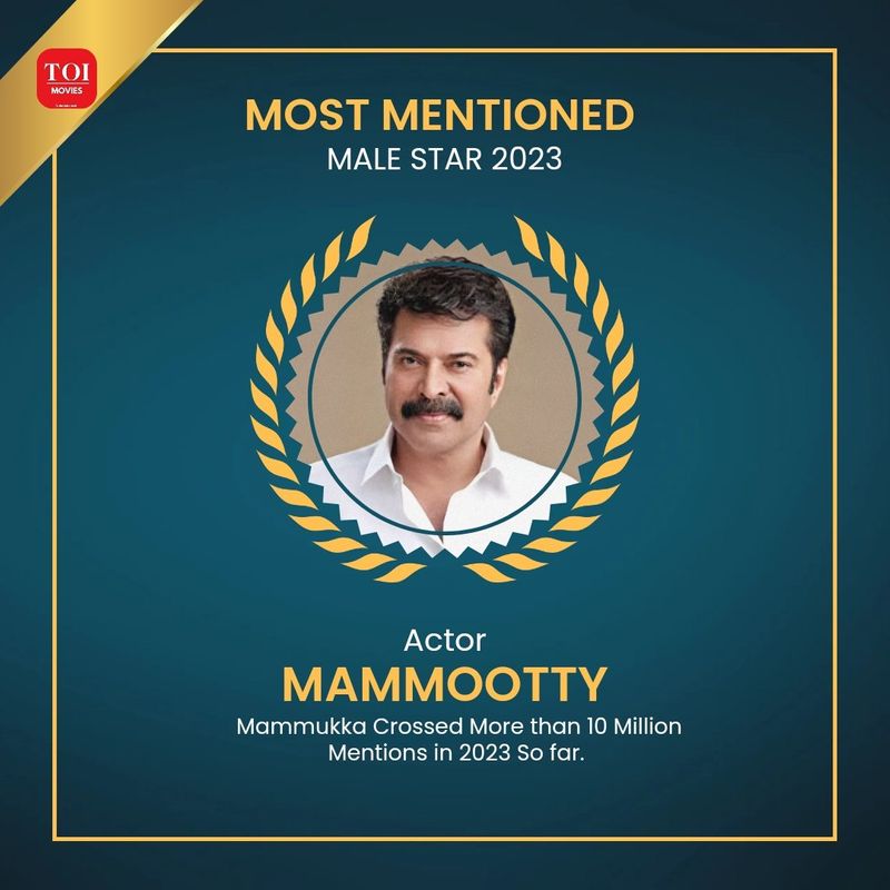 മലയാളത്തിൽ നിന്നും ഏറ്റവും കൂടുതൽ പരാമർശിക്കപ്പെട്ട പുരുഷതാരം എന്ന ഖ്യാതിയാണ് മമ്മൂട്ടി സ്വന്തമാക്കിയിരിക്കുന്നത്. 10 മില്യണിലധികം പരാമർശങ്ങളാണ് താരവുമായി ബന്ധപ്പെട്ട് നടന്നിരിക്കുന്നതെന്ന് ടൈംസ് ഓഫ് ഇന്ത്യ ട്വീറ്റ് ചെയ്യുന്നു. കണ്ണൂർ സ്ക്വാഡിലെ പ്രകടനത്തിനൊപ്പം മറ്റേതൊരു സൂപ്പർ താരവും എടുക്കാൻ മടിക്കുന്ന സ്വവർഗാനുരാഗിയായി എത്തിയ വേഷം ഏറെ ചർച്ച ചെയ്യപ്പെട്ടിരുന്നു. കാതലിലെ പ്രകടനം പല പ്രമുഖ ചർച്ചാ വേദികളിലും നിറസാന്നിധ്യം അയിമാറി.