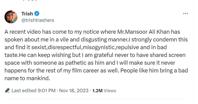 "മൻസൂർ അലി ഖാൻ എന്നെക്കുറിച്ച് നീചവും വെറുപ്പുളവാക്കുന്നതുമായ രീതിയിൽ സംസാരിച്ച ഒരു വീഡിയോ അടുത്തിടെ കാണാൻ ഇടയായി. ഞാൻ അതിൽ ശക്തമായി അപലപിക്കുകയാണ്. ലൈംഗികl, അനാദരവ്, സ്ത്രീവിരുദ്ധത, വെറുപ്പുളവാക്കുന്ന, മോശം അഭിരുചിയുള്ള ഒരാളുടെ പ്രസ്താവനയാണത്. ഇയാൾക്കൊപ്പം ഒരിക്കലും സ്ക്രീൻ സ്പേസ് പങ്കിടാത്തതിൽ ഞാൻ ഇപ്പോൾ സന്തോഷവതിയാണ്, എന്റെ സിനിമാ ജീവിതത്തിന്റെ ബാക്കി ഭാഗങ്ങളിലും അതൊരിക്കലും സംഭവിക്കില്ലെന്ന് ഞാൻ ഉറപ്പുവരുത്തും. അയാളെ പോലുള്ളവർ മനുഷ്യരാശിക്ക് തന്നെ അപമാനമാണ്", എന്നാണ് തൃഷ കുറിച്ചത്.