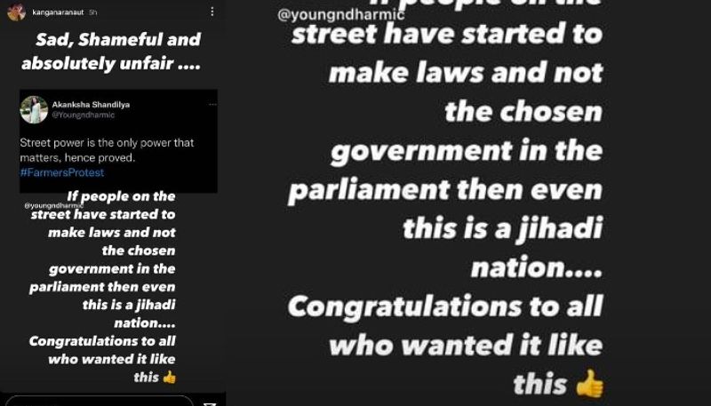 'ഈ തീരുമാനത്തില് സങ്കടമുണ്ട്, നാണക്കേടായിപ്പോയി, നീതിയുക്തമല്ലാത്ത നടപടിയായി. തെരഞ്ഞെടുക്കപ്പെട്ട സര്ക്കാരിന് പകരം തെരുവിലുള്ളവര് നിയമം നിര്മ്മിക്കാന് തുടങ്ങിയാല് ഇതൊരു ജിഹാദി രാജ്യമാകും. ഇങ്ങനെയാകണം എന്ന് ആഗ്രഹിച്ച എല്ലാവര്ക്കും അഭിനന്ദനങ്ങള്' കങ്കണ കുറിച്ചു.