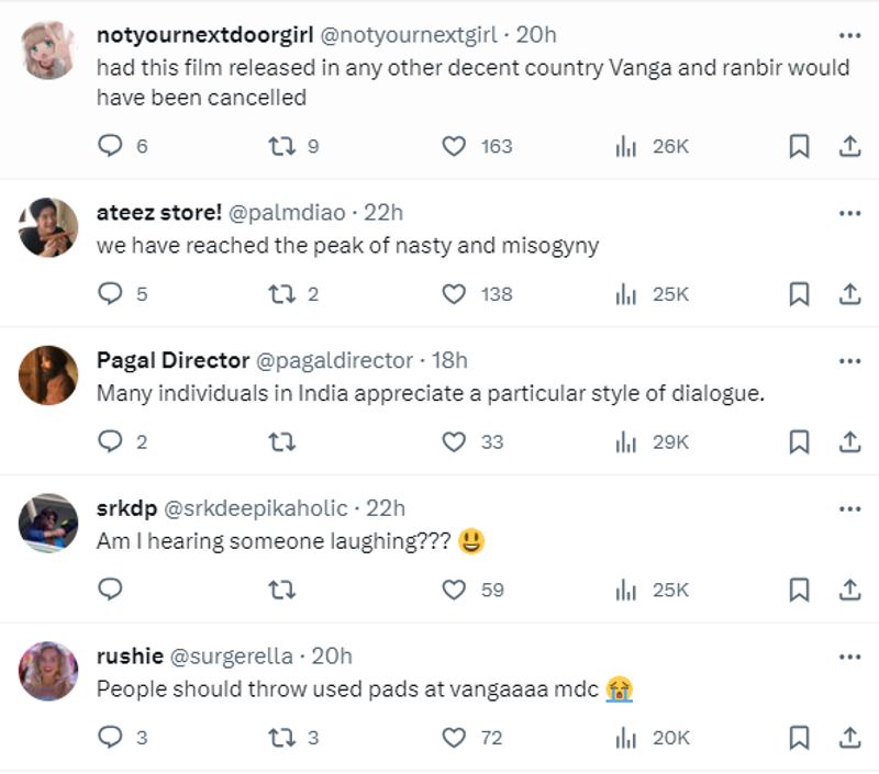 സംവിധായകന് സന്ദീപ് റെഡ്ഡി വാംഗയ്ക്കെതിരെ കടുത്ത വിമര്ശനങ്ങളാണ് എക്സ് ഉള്പ്പെടെയുള്ള സമൂഹമാധ്യമങ്ങളില് ഉയരുന്നത്. മാസത്തില് നാല് തവണയോ? അല്ല, ദിവസത്തില് നാല് പ്രാവശ്യം! സ്ത്രീ കഥാപാത്രങ്ങളെ സൃഷ്ടിക്കാനായി വാംഗ സാര് എത്രത്തോളം സമയം വിനിയോഗിക്കുന്നു എന്നതിന് തെളിവാണ് ഇത് എന്നാണ് ഒരു എക്സ് ഉപയോക്താവിന്റെ കമന്റ്. വാംഗയെ ഒരു സ്ത്രീ ഇതുവരെ സ്നേഹിച്ചിട്ടുണ്ടാവില്ലെന്നാണ് മറ്റൊരു കമന്റ്. മാസം നാല് പാഡ്!? ഇന്ത്യയില് വലിയ വിഭാഗം സ്ത്രീകള്ക്ക് പിസിഒഡിയും പിസിഒഎസുമുണ്ട്. രക്തനഷ്ടം കൂടുതലായതിനാല് ദിവസേന ആറ് പാഡുകള് വരെ ഉപയോഗിക്കേണ്ടിവരാറുണ്ട്, എന്ന് മറ്റൊരാള് കുറിക്കുന്നു. മറ്റേതെങ്കിലും രാജ്യത്തായിരുന്നുവെങ്കില് ഈ ഡയലോഗിന്റെ പേരില് സന്ദീപ് റെഡ്ഡി വാംഗയും രണ്ബീര് കപൂറും ക്യാന്സല് കള്ച്ചറിന് വിധേയരായേനെ എന്നാണ് മറ്റൊരാളുടെ കമന്റ്.