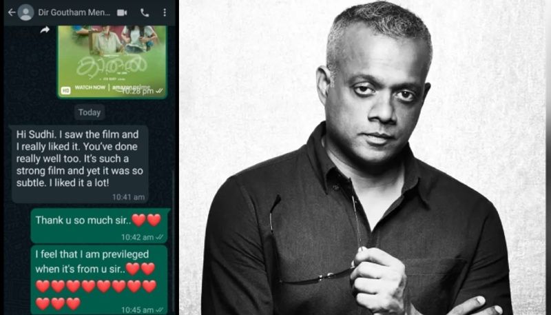 കാതല് കണ്ട് ചിത്രത്തിലെ പ്രധാന കഥാപാത്രങ്ങളിലൊന്നായ തങ്കനെ അവതരിപ്പിച്ച സുധി കോഴിക്കോടിന് മെസേജ് അയക്കുകയായിരുന്നു ഗൗതം മേനോന്. "ഹായ് സുധി, സിനിമ ഞാന് കണ്ടു. എനിക്ക് വളരെ ഇഷ്ടമായി. നിങ്ങളും വളരെ നന്നായി ചെയ്തിട്ടുണ്ട്. വളരെ ശക്തവും അതേസമയം സൂക്ഷ്മവുമായ ചിത്രമാണിത്. വളരെ ഇഷ്ടപ്പെട്ടു എനിക്ക്", എന്നാണ് ഗൗതം മേനോന് സുധിക്ക് അയച്ച സന്ദേശം.