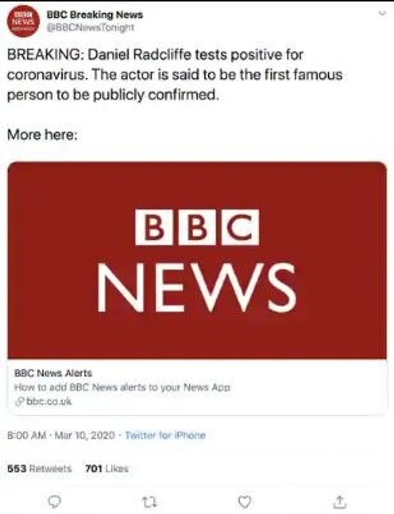 ഡാനിയേല് റാഡ്ക്ലിഫിന്റെ കൊവിഡ് 19 പരിശോധനാഫലം പോസിറ്റീവാണെന്നും കൊവിഡ് 19 ബാധിച്ച ആദ്യ സെലിബ്രിറ്റി അദ്ദേഹമാണെന്നുമാണ് ട്വീറ്റ്. ബിബിസിയുടെ ലോഗോയില് പ്രചരിച്ചതു കൊണ്ട് തന്നെ നിരവധി ആളുകള് ഈ ട്വീറ്റ് പങ്കുവെക്കുകയും ചെയ്തു. എന്നാല് സ്ക്രീന്ഷോട്ടുകള് വ്യാപകമായതോടെ വിശദീകരണവുമായി റാഡ്ക്ലിഫിന്റെ മാനേജര് രംഗത്തെത്തി.