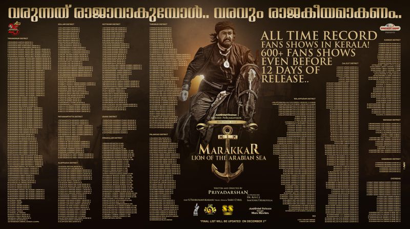 മോഹന്ലാല് ആരാധകര് (Mohanlal Fans) ഏറെക്കാലമായി കാത്തിരിക്കുന്ന ചിത്രമാണ് 'മരക്കാര്: അറബിക്കടലിന്റെ സിംഹം' (Marakkar). ആദ്യം ഒടിടി റിലീസ് പ്രഖ്യാപിച്ചിരുന്ന ചിത്രം അതു മാറ്റി തിയറ്ററുകളിലേക്ക് എത്തുന്നതിന്റെ ആവേശത്തിലാണ് അവര്. അതിനാല്ത്തന്നെ റിലീസ് പരമാവധി ആഘോഷമാക്കാനാണ് മോഹന്ലാല് ആരാധക സംഘങ്ങളുടെ തീരുമാനം. റിലീസ് ദിനത്തിലെ ഫാന്സ് ഷോകളുടെ എണ്ണത്തില് റെക്കോര്ഡ് ഇടാന് ഒരുങ്ങുകയാണ് ചിത്രം. റിലീസിന് 10 ദിവസം ശേഷിക്കെ നിലവില് തീരുമാനിക്കപ്പെട്ടിരിക്കുന്ന കേരളത്തിലെ ഫാന്സ് ഷോകളുടെ ചാര്ട്ട് പ്രസീദ്ധീകരിച്ചിരിക്കുകയാണ് മോഹന്ലാല് ഫാന്സ്. ഇതനുസരിച്ച് 600ല് അധികം ഫാന്സ് ഷോകളാണ് റിലീസ് ദിനത്തില് കേരളത്തില് മാത്രം ചിത്രത്തിന്.