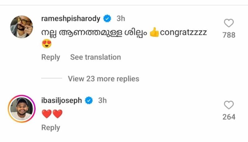 പോസ്റ്റിന് താഴെ ടൊവിനോയെ പ്രശംസിച്ച് കൊണ്ട് നിരവധി പേരാണ് രംഗത്ത് എത്തിയത്. ഇവയ്ക്കൊപ്പം 'നല്ല ആണത്തമുള്ള ശില്പം' എന്നാണ് രമേഷ് പിഷാരടി കുറിച്ചത്. പിഷാരടിയുടെ കമന്റിന് മറുപടിയുമായി നിരവധി പേരാണ് രംഗത്ത് എത്തിയത്. 'അത് കിടുക്കി, കൊള്ളേണ്ടവർക്ക് കൊള്ളും, ഒന്നു എഴുന്നേറ്റ് ബഹുമാനിക്കാൻ തോന്നുന്നുണ്ടോ', എന്നിങ്ങനെ പോകുന്നു കമന്റുകൾ. വിവിധ ട്രോൾ പേജുകളിലും പിഷാരടിയുടെ കമന്റ് നിറയുന്നുണ്ട്.