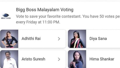 ബിഗ് ബോസ് മലയാളം വോട്ടിംഗ് (Bigg Boss Malayalam Voting) എന്ന് ഗൂഗിളില് സെര്ച്ച് ചെയ്ത് വോട്ടിംഗില് പങ്കുചേരാം. ഹൗസ് മേറ്റ്സ് എലിമിനേഷന് റൗണ്ടില് വോട്ട് ചെയ്യുന്നതോടെ വോട്ടിംഗ് ആരംഭിക്കും. (ഓൺലൈൻ വോട്ട് ചെയ്യാൻ ഇവിടെ ക്ലിക്ക് ചെയ്യുക)