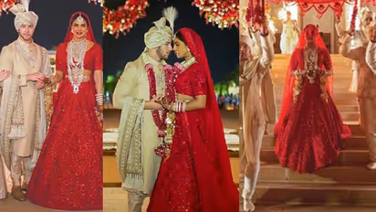 ജോധ്പൂരിലെ ഉമൈദ് ഭവൻ കൊട്ടാരത്തിൽ വച്ച് നടന്ന ഹിന്ദുമത ആചാരം പ്രകാരം നടന്ന വിവാഹത്തിന്റെ കൂടുതൽ ചിത്രങ്ങളാണ് ഇപ്പോൾ പുറത്തുവന്നിരിക്കുന്നത്. സബ്യസാചി മുഖർജി ഒരുക്കിയ ചുവന്ന ലഹങ്കയിൽ വജ്രാഭരണങ്ങൾ അണിഞ്ഞ് രാജകുമാരിയെ പോലെയാണ് പ്രിയങ്ക എത്തിയത്. സ്വർണ്ണനിറമുള്ള പരമ്പരാഗതമായ രീതിയിലുളള ഇന്ത്യന് സില്ക്ക് ഷർവാണിയിൽ രാജകുമാരനെ പോലെ നിക്കിനെയും ചിത്രങ്ങളിൽ കാണാമായിരുന്നു. സബ്യസാചി ഹെറിറ്റേജ് ജുവലറി കലക്ഷനില് നിന്നുളള മുഗൾ കുന്തൻ ആഭരണങ്ങളും വജ്രാഭരണങ്ങളുമാണ് ഇരുവരും അണിഞ്ഞത്.