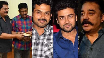 മുഖ്യമന്ത്രിയുടെ ദുരിതാശ്വാസ നിധിയിലേക്ക് 25 ലക്ഷം രൂപയാണ് തമിഴ് താരസഹോദരങ്ങളായ സൂര്യയും കാര്ത്തിയും ചേര്ന്ന് നല്കിയത്. 25 ലക്ഷം രൂപ കമലഹാസനും സംഭാവന ചെയ്തു. ദുരിതാശ്വാസത്തിനായി തമിഴ് ചാനലായ വിജയ് ടിവിയും 25 ലക്ഷം രൂപ സഹായധനം നല്കിയിട്ടുണ്ട്.