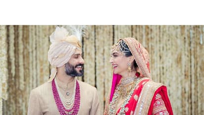 അനുരാധ വാകില് തയ്യാറാക്കിയ ചുവന്ന നിറത്തിലുളള ലെഹങ്കയാണ് സോനം വിവാഹ ദിവസം ധരിച്ചിരിക്കുന്നത്. സ്വര്ണ നിറത്തിലുള്ള ഷെര്വാണിയാണ് വരന് ആനന്ദ് ആഹുജയുടെ വേഷം. മുംബൈയില് സോനത്തിന്റെ ആന്റിയുടെ ബംഗ്ലാവിലാണ് വിവാഹച്ചടങ്ങുകള് നടക്കുന്നത്. തുടര്ന്ന് വൈകുന്നേരം ലീലയില് ബോളിവുഡ് താരങ്ങള്ക്കായി ഗംഭീര വിരുന്നൊരുക്കിയിട്ടുണ്ട്. ബോളിവുഡിലെ വന് താരനിരയാണ് വിവാഹത്തിനെത്തിയത്.