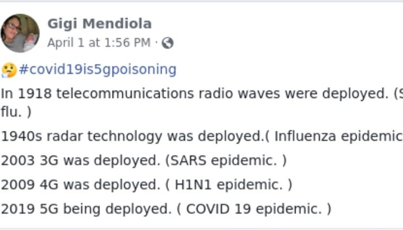 1ജി മുതല് 5ജി വരെയുള്ള ടെലികോം സാങ്കേതിക വിദ്യകള് പ്രാബല്യത്തില് വന്നപ്പോഴാണ് ലോകത്ത് പകര്ച്ചവ്യാധികളും മഹാമാരികളുമുണ്ടായത് എന്നാണ് ഈ വാദം. ഓരോ നെറ്റ്വര്ക്കുകളും നടപ്പാക്കിയ വര്ഷവും ആ വര്ഷം പടര്ന്നുപിടിച്ച പകര്ച്ചവ്യാധിയുടെ പേരും പറയുന്ന ചിത്രം സഹിതമാണ് ഈ പ്രചാരണം. ഏപ്രില് രണ്ട് മുതല് ഫേസ്ബുക്ക്, ട്വിറ്റര് അടക്കമുള്ള സാമൂഹ്യമാധ്യമങ്ങളില് ഈ പ്രചാരണം ശക്തമാണ്.