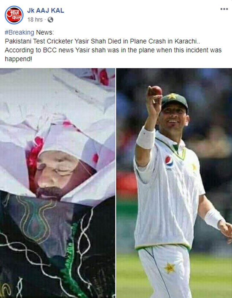 ഹൃദയഭേദകമായ വാര്ത്ത(Heart Breaking News) എന്ന തലക്കെട്ടോടെയാണ് പോസ്റ്റുകളും ട്വീറ്റുകളും സജീവമായത്. 'പാകിസ്ഥാന് ടെസ്റ്റ് ക്രിക്കറ്റര് യാസിര് ഷാ അപകടത്തില് മരിച്ചു. അപകടം നടക്കുമ്പോള് യാസിര് ഷാ വിമാനത്തിലുണ്ടായിരുന്നു എന്നാണ് ബിബിസി റിപ്പോര്ട്ട് ചെയ്തത്'- ഇതായിരുന്നു പ്രചാരണം. മരിച്ചുകിടക്കുന്ന ഒരാളുടെ ചിത്രവും ഒപ്പമുണ്ടായിരുന്നു.