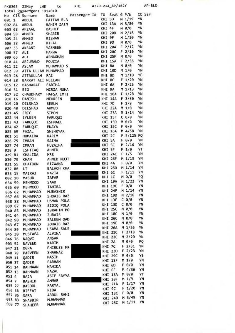 വിമാനത്തിലുണ്ടായിരുന്ന യാത്രക്കാരുടെ പേരുവിവരങ്ങള് പാകിസ്ഥാനിലെ പ്രമുഖ മാധ്യമങ്ങളായ ഡോണും ജിയോ ടിവിയും പുറത്തുവിട്ടിട്ടുണ്ട്. എന്നാല്, ഇതില് യാസിര് ഷാ എന്ന ഒരാളുടെ പേരില്ല.