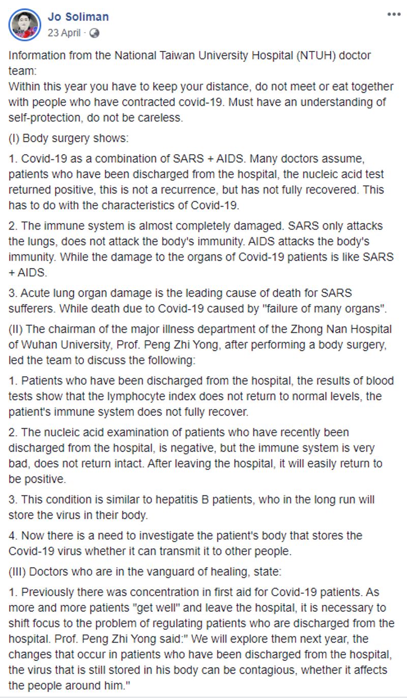തായ്വാന് നാഷണല് സര്വകലാശാലയിലെ ഡോക്ടര്മാര് കൊവിഡിനെ കുറിച്ച് ഒരു രഹസ്യം കണ്ടെത്തി എന്നാണ് പ്രചാരണം. കൊറോണ വൈറസ് എയ്ഡ്സിന്റെയും സാര്സിന്റെയും സങ്കലന വൈറസാണ് എന്ന് ഫേസ്ബുക്ക് പോസ്റ്റുകളില് പറയുന്നു.