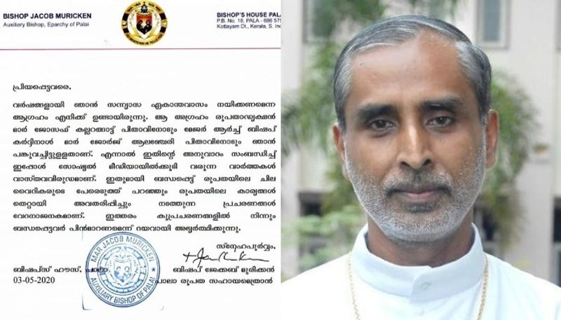 സ്ഥാനത്യാഗത്തെ കുറിച്ചുള്ള പ്രചാരണങ്ങള് സാമൂഹ്യമാധ്യമങ്ങളില് സജീവമായതോടെ വിശദീകരണവുമായി മാര് ജേക്കബ് മുരിക്കന് രംഗത്തെത്തി. പ്രിയപ്പെട്ടവരെ, എന്ന് തുടങ്ങുന്ന കത്തിലൂടെയാണ് മാര് ജേക്കബ് മുരിക്കന് കാര്യങ്ങള് വിശദമാക്കിയത്. സ്ഥാനത്യാഗം ചെയ്തിട്ടില്ലെന്നും എന്നാല് സന്യാസ ഏകാന്തവാസം എന്നത് നാളുകളായുള്ള ആഗ്രഹമാണെന്നും കത്തില് പറയുന്നു.