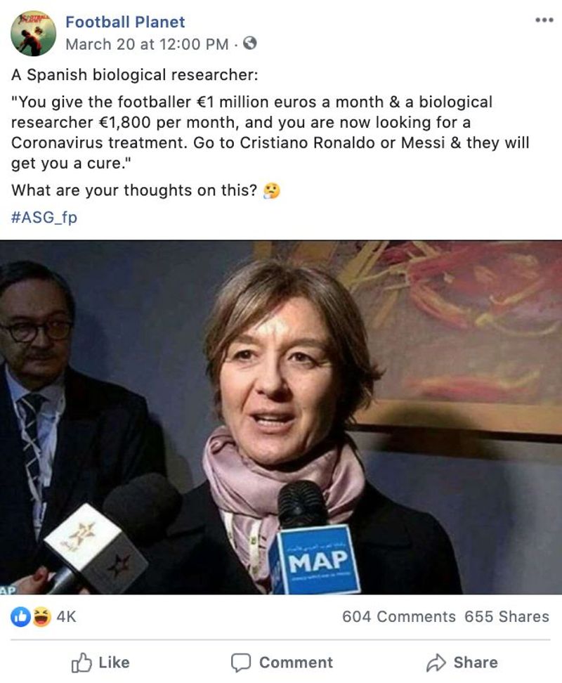 'ഒരു മില്യണ് യൂറോയാണ് ഫുട്ബോള് താരങ്ങളുടെ പ്രതിഫലം. ശാസ്ത്രജ്ഞര്ക്ക് നല്കുന്നതാകട്ടെ 1,800യൂറോയും. കൊവിഡിന് ചികിത്സിക്കാന് ഞങ്ങളോട് ആവശ്യപ്പെടുന്നു. കൊവിഡിനെതിരെ വാക്സിന് കണ്ടുപിടിക്കാന് ക്രിസ്റ്റ്യാനോ റൊണാള്ഡോയോടോ മെസ്സിയോടോ പറയൂ, അവര് ചികിത്സിക്കും'- 'ഫുട്ബോള് പ്ലാനറ്റ്' എന്ന ഫേസ്ബുക്ക് പേജിലാണ് സ്പാനിഷ് ജീവശാസ്ത്ര ഗവേഷക പറഞ്ഞു എന്ന പേരില് ഇങ്ങനെ ഒരു കുറിപ്പ ്പ്രത്യക്ഷപ്പെട്ടത്.