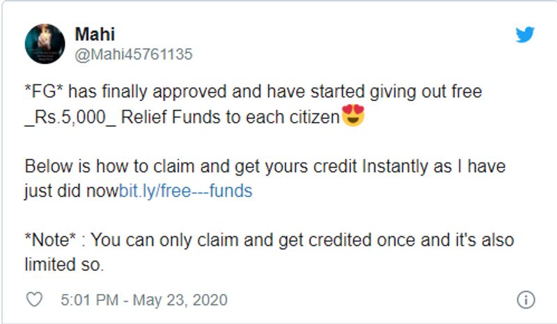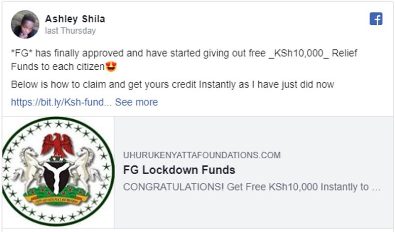 ലിങ്കില് ക്ലിക്ക് ചെയ്ത് ധനസഹായത്തിനായി അപേക്ഷ സമര്പ്പിക്കാനുള്ള സന്ദേശം നേരത്തെ കെനിയയിലും വൈറലായിരുന്നു എന്ന് ഫാക്ട് ചെക്ക് വെബ്സൈറ്റായ ബൂംലൈവ് കണ്ടെത്തി. 10,000 കെനിയന് ഷില്ലിംഗ്സ് നല്കുന്നു എന്നാണ് അവിടെ പ്രചരിച്ച സന്ദേശത്തില് പറയുന്നത്.