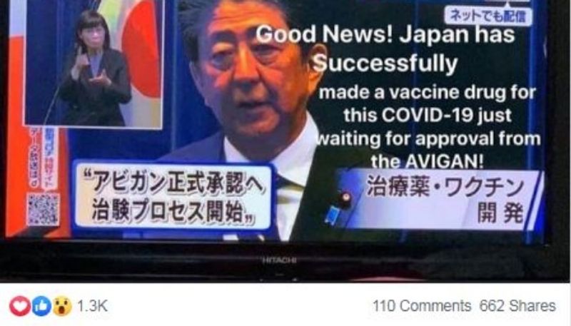 ജപ്പാന് 'അവിഗാന്' എന്ന പേരില് ഒരു വാക്സിന് കണ്ടെത്തിയെന്ന് മാർച്ച് 29ന് പ്രത്യക്ഷപ്പെട്ട ഒരു ഫേസ്ബുക്ക് പോസ്റ്റ് അവകാശപ്പെടുന്നു. ജപ്പാനിലെ ഒരു ടെലിവിഷന് ചാനലില് വന്ന റിപ്പോർട്ട് എന്ന നിലയ്ക്കുള്ള ഒരു സ്ക്രീന്ഷോട്ടാണ് പ്രചരിച്ചത്. ജപ്പാന് പ്രധാനമന്ത്രി ഷിന്സോ ആബേയുടെ ചിത്രവും സ്ക്രീന്ഷോട്ടിലുണ്ട്. ഇതോടെ ഫേസ്ബുക്കിലും ട്വിറ്ററിലും ഈ സ്ക്രീന്ഷോട്ട് വ്യാപകമായി പ്രചരിക്കുകയായിരുന്നു.