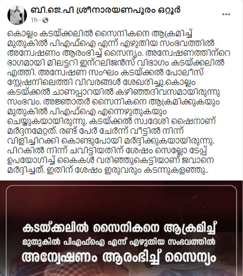 കേരളത്തില് ഒരു സൈനികനെ മര്ദിച്ചതായും മുതുകില് നിരോധിത സംഘടനയായ പിഎഫ്ഐയുടെ പേര് എഴുതിയെന്നതും ദേശീയ മാധ്യമങ്ങള് ഉള്പ്പടെ വലിയ വാര്ത്തയാക്കിയിരുന്നു. എന്ഡിടിവി നല്കിയ വാര്ത്ത ലിങ്കില് വായിക്കാം. ഇതോടൊപ്പം നിരവധി ഫേസ്ബുക്ക് പോസ്റ്റുകളും സൈനികനെതിരായ ആക്രമണത്തെ അപലപിച്ച് പ്രത്യക്ഷപ്പെട്ടു. സൈനികനെ ആക്രമിച്ച് പിഎഫ്ഐ എന്ന് മുതുകില് പച്ചകുത്തിയത് സംബന്ധിച്ച് ബി.ജെ.പി ശ്രീനാരയണപുരം ഒറ്റൂർ എന്ന ഫേസ്ബുക്ക് പേജില് വന്ന പോസ്റ്റ് ചുവടെ.