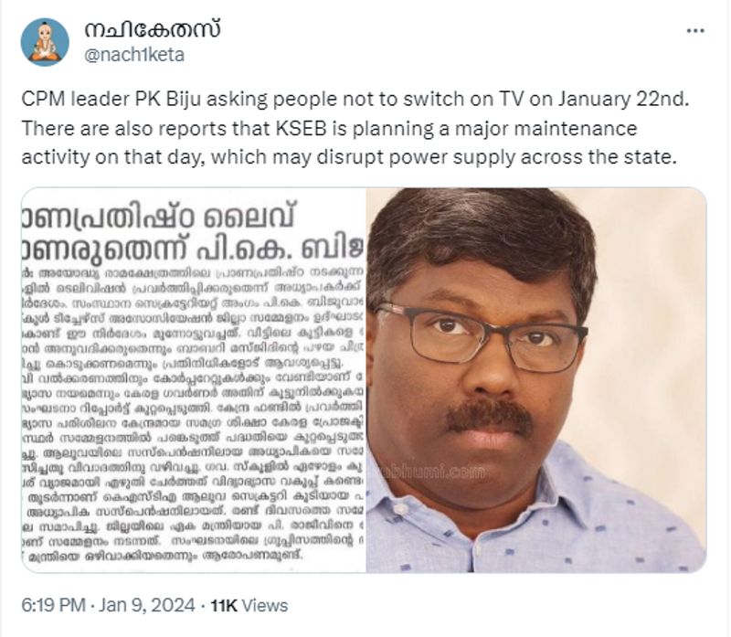 തിരുവനന്തപുരം: അയോധ്യ രാമക്ഷേത്രത്തിന്റെ പ്രതിഷ്ഠാ കര്മ്മം അടുത്തിരിക്കെ സാമൂഹ്യമാധ്യങ്ങളില് വ്യാപകമായി ഒരു പ്രചാരണം. പ്രതിഷ്ഠാ കര്മ്മം നടക്കുന്ന 2024 ജനുവരി 22ന് കേരളത്തിലെ വൈദ്യുതിമേഖലയില് വലിയ അറ്റകുറ്റപണി നടക്കുന്നതായും അന്നേദിനം സംസ്ഥാനത്ത് വ്യാപകമായി വൈദ്യുതി മുടങ്ങും എന്നുമാണ് സോഷ്യല് മീഡിയയിലെ പ്രചാരണം. ഫേസ്ബുക്കില് മലയാളത്തിലും എക്സില് (പഴയ ട്വിറ്റര്) നോര്ത്തിന്ത്യയിലും ഈ ക്യാംപയിന് ശക്തമായിരിക്കുന്ന സാഹചര്യത്തില് പ്രചാരണത്തിന്റെ വസ്തുത പരിശോധിക്കാം.