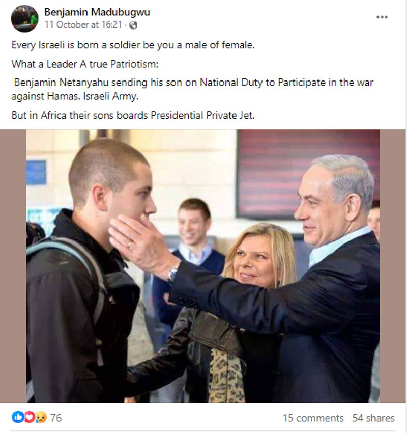 ഹമാസിനെ നേരിടാന് ഗാസയിലേക്ക് ഇസ്രയേല് പ്രധാനമന്ത്രി ബെഞ്ചമിൻ നെതന്യാഹു തന്റെ മകനെ അയക്കുന്നു എന്ന തലക്കെട്ടോടെയുള്ള ചിത്രം തെറ്റിദ്ധരിപ്പിക്കുന്നതാണ്. ഐഡിഎഫിലേക്ക് ഇളയ മകനെ നെതന്യാഹു യാത്രയാക്കുന്നതിന്റെ 2014ലെ ചിത്രമാണ് ഇപ്പോഴത്തെ സംഭവവികാസങ്ങളുടെത് എന്ന കുറിപ്പുകളോടെ സാമൂഹ്യമാധ്യമങ്ങളില് പോസ്റ്റ് ചെയ്യപ്പെടുന്നത്.