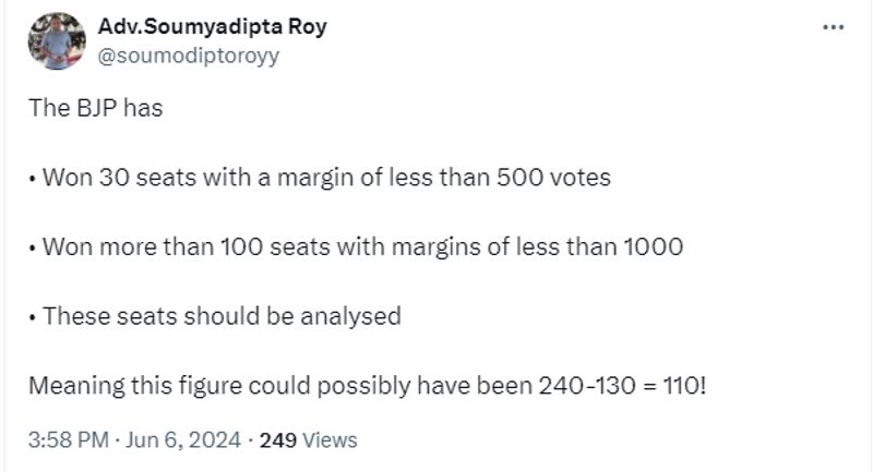 എക്സിലെ പോസ്റ്റില് പറയുന്നത് പോലെയുള്ള ഫലമാണോ ബിജെപിക്ക് തെരഞ്ഞെടുപ്പില് ലഭിച്ചത് എന്ന് പരിശോധിച്ചു. ഈ പരിശോധനയില് വ്യക്തമായ കാര്യങ്ങള് ഇതാണ്... ലോക്സഭ തെരഞ്ഞെടുപ്പിലെ 240 സീറ്റുകളില് വിജയിച്ച ബിജെപിക്ക് ലഭിച്ച ഏറ്റവും കുറഞ്ഞ ഭൂരിപക്ഷം 1587 വോട്ടുകളാണ്. തെരഞ്ഞെടുപ്പ് കമ്മീഷന്റെ വെബ്സൈറ്റില് നിന്നാണ് ഇക്കാര്യം ബോധ്യപ്പെട്ടത്. ഒഡിഷയിലെ ജാജ്പൂര് മണ്ഡലത്തിലെ ബിജെപി സ്ഥാനാര്ഥി രബീന്ദ്ര നാരായണ് ബെഹ്റയാണ് 1587 വോട്ടുകളുടെ ഭൂരിപക്ഷത്തില് വിജയിച്ചയാള്. ഇതിനാല് തന്നെ ബിജെപിയുടെ തെരഞ്ഞെടുപ്പ് ഫലവുമായി ബന്ധപ്പെട്ട പ്രചാരണം വ്യാജമാണ് എന്ന് ഉറപ്പിക്കാം.