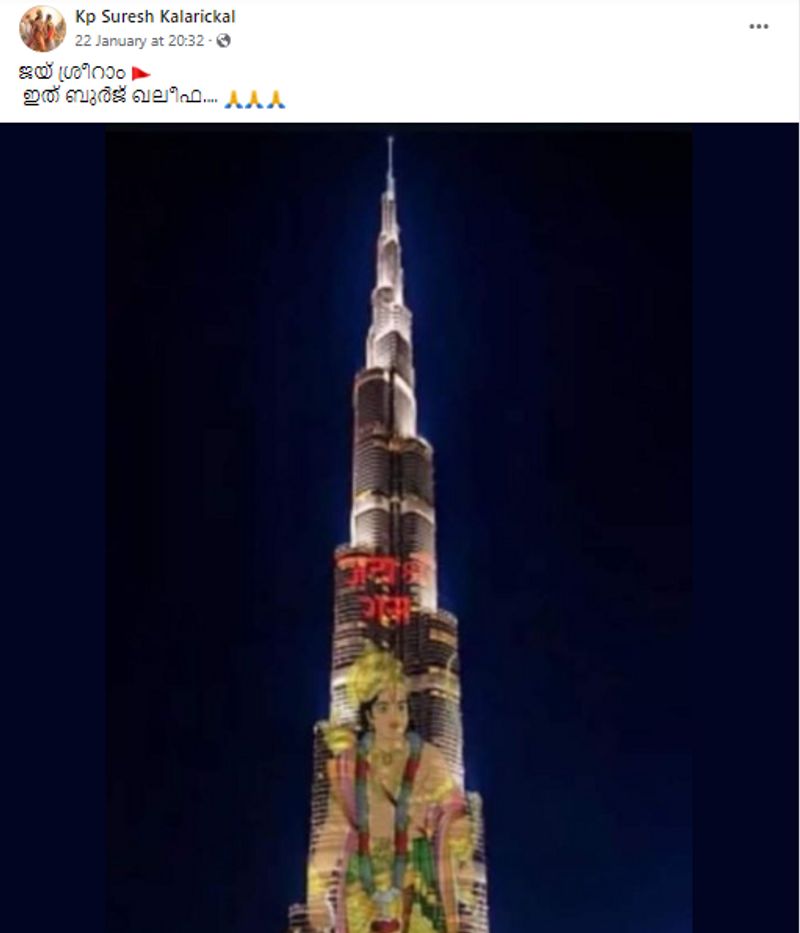 അയോധ്യയിലെ രാമക്ഷേത്ര പ്രതിഷ്ഠാ കർമ്മവുമായി ബന്ധപ്പെട്ട് ശ്രീരാമന്റെ ചിത്രം ബുർജ് ഖലീഫയില് പ്രദർശിപ്പിച്ചു എന്ന ഫോട്ടോ പ്രചാരണം വ്യാജമാണ്.