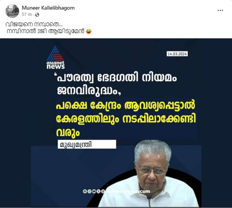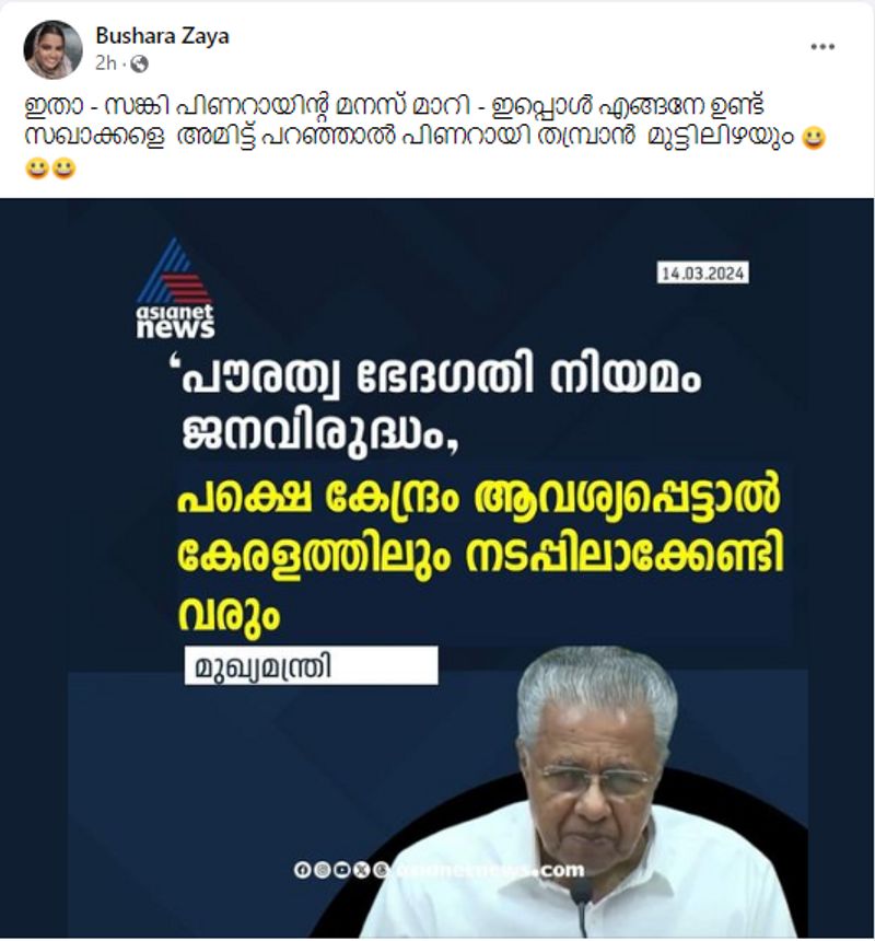 'പൗരത്വ ഭേദഗതി നിയമം ജനവിരുദ്ധം, പക്ഷേ കേന്ദ്രം ആവശ്യപ്പെട്ടാല് കേരളത്തിലും നടപ്പാക്കേണ്ടി വരും' എന്ന തരത്തില് മുഖ്യമന്ത്രി പിണറായി വിജയന് പ്രസ്താവന നടത്തിയിട്ടില്ല എന്നതും വസ്തുതതയാണ്. നിരവധി പേരാണ് ഏഷ്യാനെറ്റ് ന്യൂസിന്റെ പേരിലുള്ള വ്യാജ കാര്ഡ് ഫേസ്ബുക്കില് പ്രചരിപ്പിക്കുന്നത്. അവയുടെ സ്ക്രീന്ഷോട്ടുകള് ചുവടെ ചേര്ക്കുന്നു.